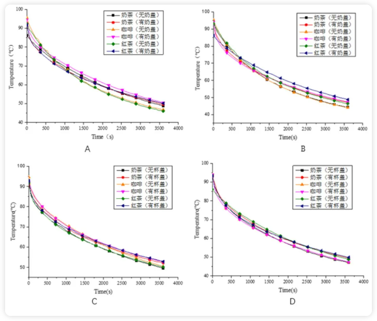 (A 为淋膜纸杯在无杯盖情况下温度变化曲线;B 为PP杯在无杯盖情况下温度变化曲线;C 为淋膜纸杯在有奶盖情况下温度变化曲线;D 为PP杯在有奶盖情况下温度变化曲线)